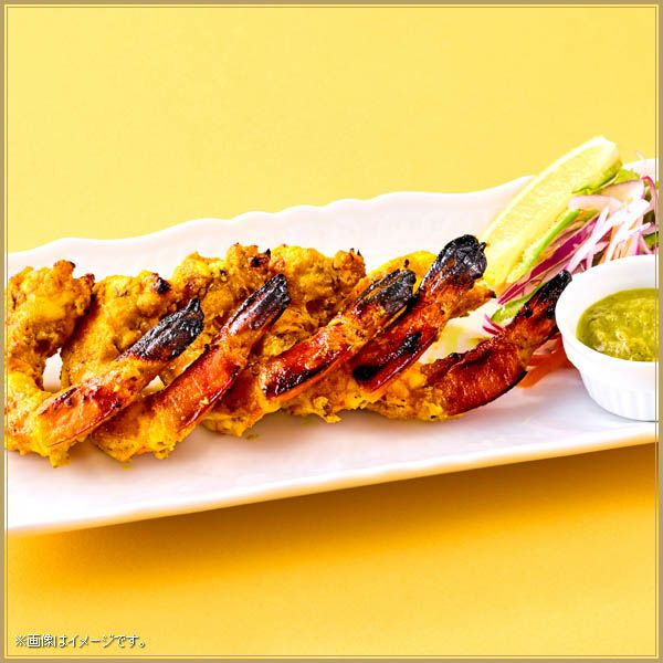 海老をヨーグルトと★AJANTA★オリジナルスパイスでマリネをしてインド特有の土釜(タンドール)にて串焼きにしています。